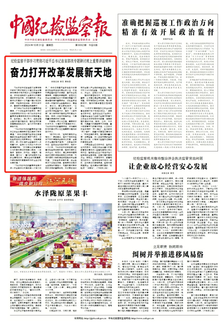 习近平总书记在省部级主要领导干部学习贯彻党的二十届三中全会精神专题研讨班开班式上发表重要讲话,深刻总结新时代全面深化改革取得的历史性成就,深刻阐明进一步全面深化改革的一系列重大理论和实践问题,对坚持守正创新、讲求科学方法、营造良好氛围提出明确要求。学习领会习近平总书记重要讲话精神,广大纪检监察干部表示,要切实把思想和行动统一到习近平总书记重要讲话精神和党中央决策部署上来,坚定信心、凝心聚力,在新征程上推动改革行稳致远、推动各项改革举措精准落地见效,奋力打开改革发展新天地。“习近平总书记的重要讲话为推动三中全会精神贯彻落实提供了根本遵循。”中央纪委国家监委驻应急管理部纪检监察组组长蒲宇飞表示,纪检监察组将立足职责定位、加强调查研究,进一步找准政治监督的切入点和着力点,坚持以系统观念为深化改革清障护航,“紧紧围绕应急管理部系统改革发展实际和群众期待,一体推进‘查案件、防风险、促整改、堵漏洞、塑文化’,着力铲除腐败滋生的土壤和条件,清除各类改革障碍,为顺利推进改革营造良好政治生态和发展环境。”“习近平总书记的重要讲话是对进一步全面深化改革的再一次有力动员。”中央纪委国家监委驻自然资源部纪检监察组组长魏山忠介绍,该组负责监督的自然资源部、国家林业和草原局、中国地质调查局,在落实三中全会部署的生态文明建设等重大改革举措中肩负重要使命,纪检监察组将进一步推动政治监督具体化、精准化、常态化,围绕耕地保护、“三北”工程攻坚战等“国之大者”,综合运用多种监督方式,推动“一部两局”有力有序有效推进各项改革任务落地,促进人与自然和谐共生,为高质量发展提供有力保障。改革是一项系统工程,需要讲求科学方法,处理好方方面面的关系。习近平总书记的重要讲话,深刻阐明抓好改革这项系统工程需要处理好的四对关系。“四对关系中,‘坚持改革和法治相统一’摆在首位,释放了党中央坚定不移协调推进全面深化改革、全面依法治国的强烈信号。”江西省纪委书记、监委主任马森述表示,党的十八大以来,习近平总书记亲自谋划部署纪检监察体制改革,推进反腐败工作法治化、规范化,建立具有中国特色的反腐败领导体制和工作机制,引领反腐败斗争取得压倒性胜利并全面巩固,“实施监察体制改革,出台监察法及实施条例等,都是更好发挥法治在排除改革阻力、巩固改革成果中积极作用的重要体现。我们要总结运用好全面从严治党的有益经验,强化对权力运行的监督,不断提升规范化、法治化、正规化水平。”推动改革落地见效,抓落实至关重要,必须建立健全责任明晰、链条完整、环环相扣的工作机制,强化跟踪问效,推动改革举措落实落细落到位。“以钉钉子精神推动三中全会部署在湖南不折不扣落实到位。”湖南省纪委书记、监委主任王双全表示,将督促全省各级各部门全面对标看齐三中全会决定和党中央部署,准确把握改革的方向、原则、立场、方法等,凡属重大改革都要于法有据,重大敏感事项及时请示报告,以实际行动坚定拥护“两个确立”、坚决做到“两个维护”;把重大改革落实情况纳入“树牢正确政绩观,推动高质量发展”主题监督,纳入正在开展的省委第七轮巡视,以强有力监督执纪确保改革落地生根。内蒙古自治区纪委书记、监委主任刘爽表示,将把三中全会重大改革部署落实情况纳入监督检查和巡视巡察内容,督促自治区各级党组织始终坚持党的全面领导,正确处理改革和法治、破和立、改革和开放、部署和落实的关系。坚持党性党风党纪一起抓、正风肃纪反腐相贯通,坚持风腐同查同治,坚决清除妨碍改革的“拦路虎”“绊脚石”。把从严管理监督和鼓励担当作为高度统一起来,旗帜鲜明为在改革中敢创新、勇攻坚的干部撑腰鼓劲,凝聚起推动改革、促进发展的强大合力。改革开放只有进行时,没有完成时。越是在乱云飞渡的复杂环境中前行,越要坚定信心、凝心聚力,打开改革发展新天地。“我们将深刻领悟习近平总书记重要讲话中蕴含的理论内涵与实践路径,紧密结合三中全会擘画的改革路线图,心怀‘国之大者’强化监督护航。”浙江省杭州市纪委书记、监委主任陈一行介绍,市纪委监委将紧扣杭州承担的多项国家级改革试点任务,及时发现和纠正改革落实中的温差落差偏差,督促整改、跟踪问效,持续打通堵点卡点难点。“习近平总书记的重要讲话对于国资央企全面准确理解三中全会精神,坚定改革信心、把准改革方向、强化改革责任,具有十分重要和深远的意义。”华润集团纪委副书记牛正良表示,集团纪委将立足政治监督首要职责,紧紧围绕党中央关于做强做优做大国有企业等决策部署落实情况开展监督,确保集团各项改革发展事业始终沿着正确政治方向前进。